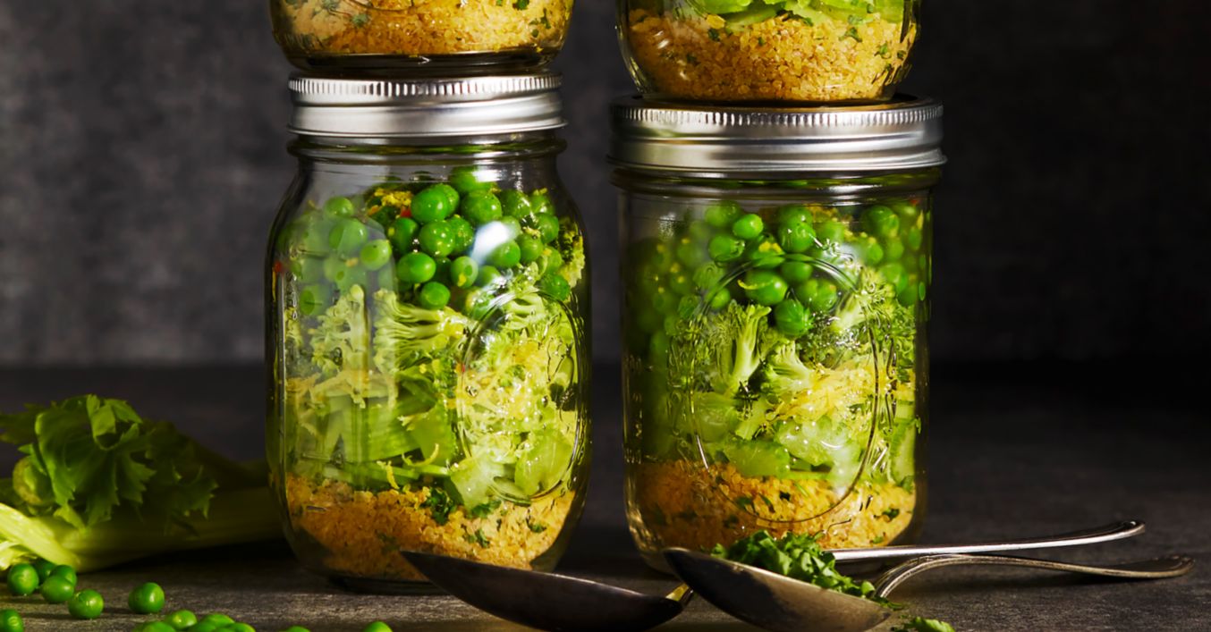 Bulgur in 4 großen verschließbaren Gläsern verteilen. Jeweils 1 Esslöffel der geschnittenen Kräuter, 1 Teelöffel Gemüsebrühe und etwas geriebene Zitronenschale auf den Bulgur streuen. Staudensellerie, Brokkoli und Erbsen in das Glas schichten.