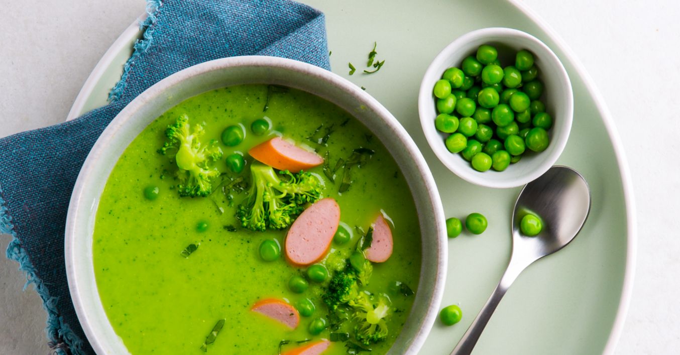 Brühe mit Haferdrink aufkochen. Erbsen hineingeben und 5 Minuten bei geschlossenem Topfdeckel köcheln lassen.