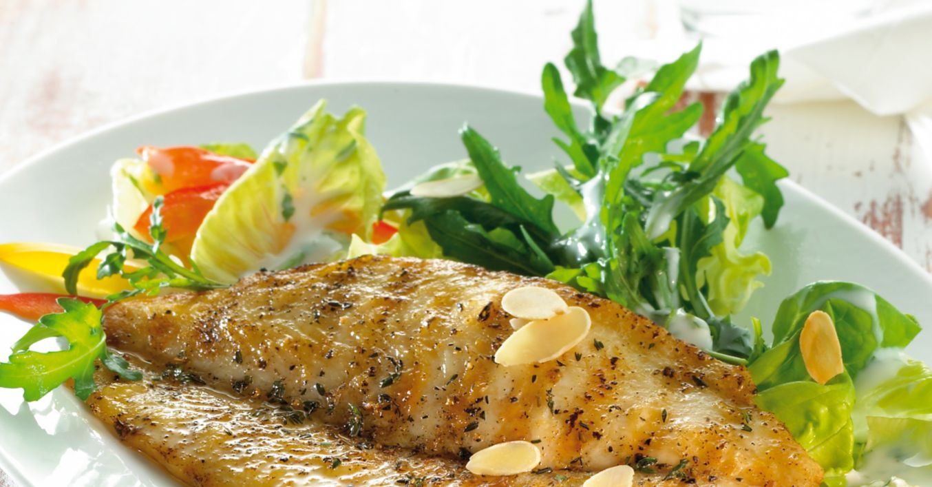 Salat mit dem Dressing zu den Pangasiusfilets, verfeinert mit Mandelblättchen, servieren. Dazu passen kross gebackene Baguettescheiben.
