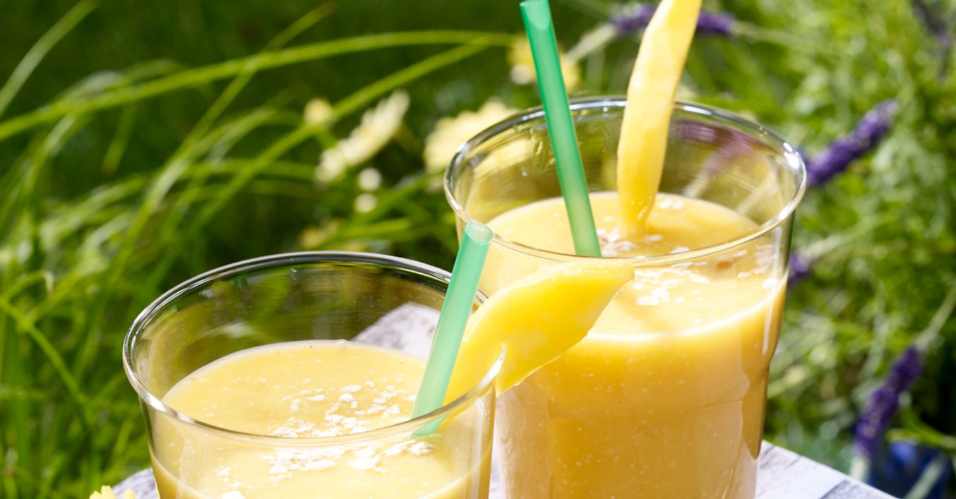 Smoothie in hohe Gläser füllen, nach Wunsch mit Mangospalten garnieren und mit einem dicken Strohhalm servieren.
