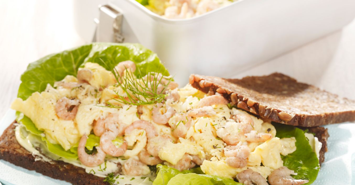 Salat waschen und trocken tupfen. Ei und Milch verquirlen und mit Salz und Pfeffer würzen. Krabben in erhitztem Öl anbraten, Rührei dazugeben und stocken lassen.