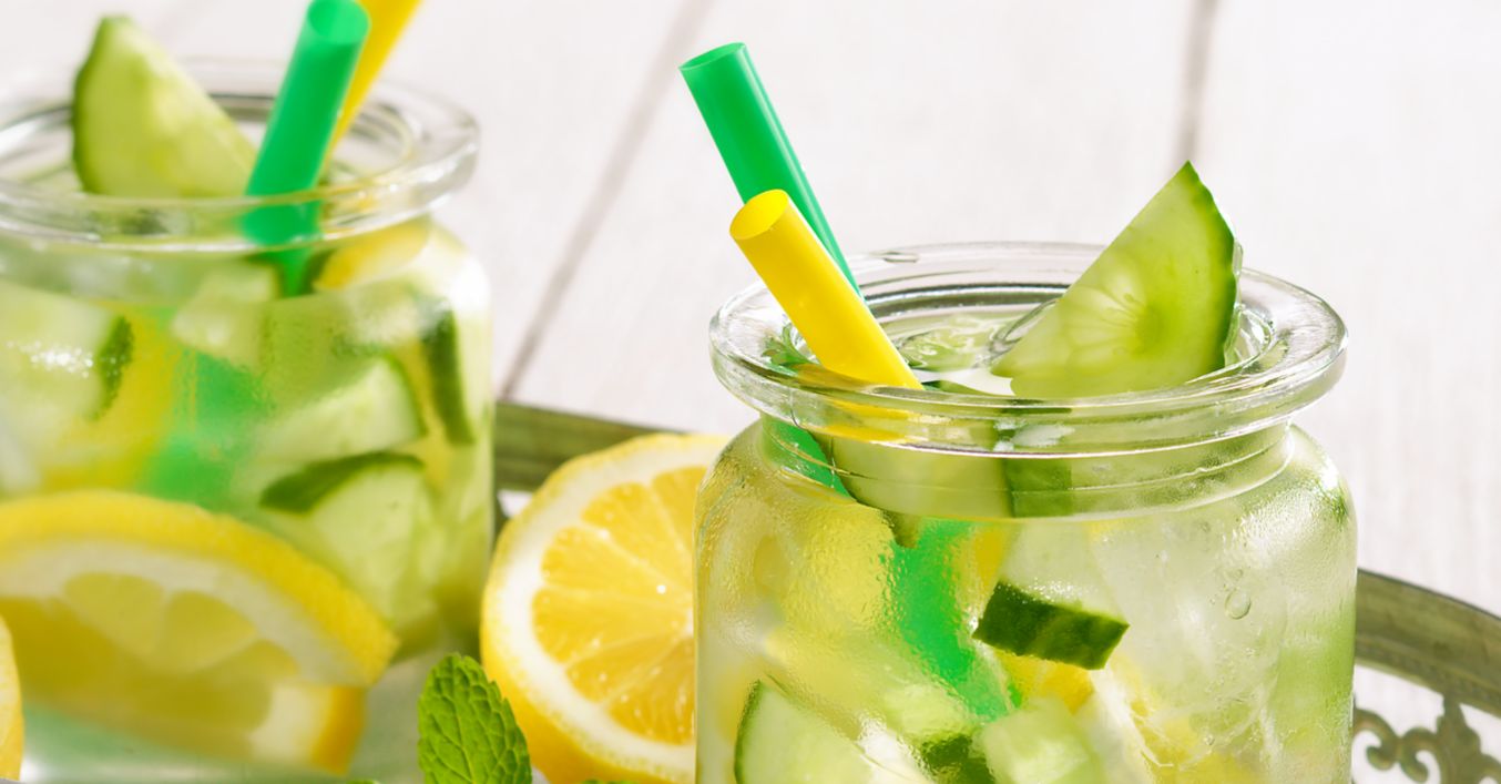 Zitrone und Gurke gründlich waschen. Die Zitrone in feine Scheiben oder Spalten schneiden, die Gurke würfeln.