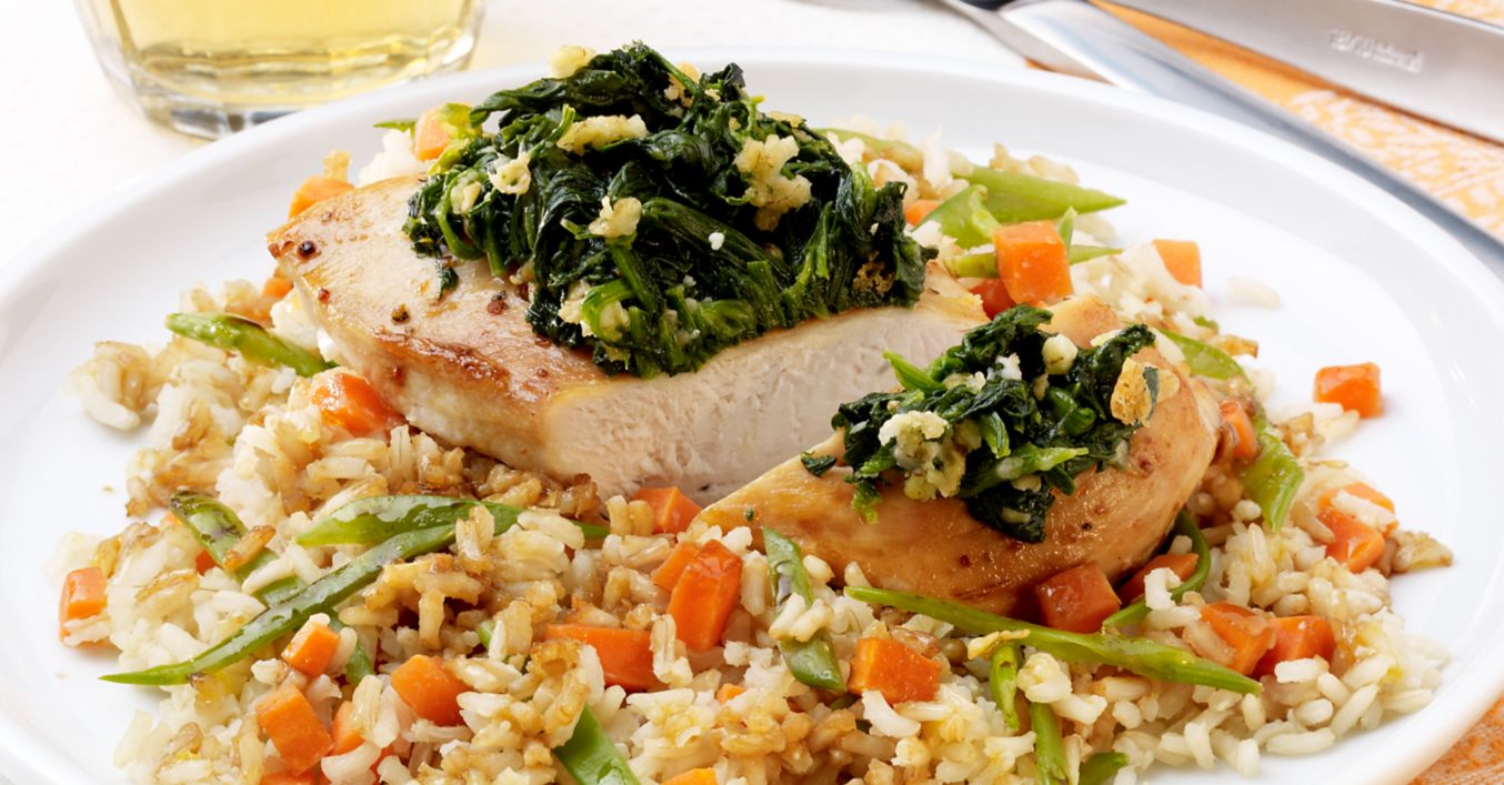 Hähnchenbrustfilets waschen, trocken tupfen, mit Salz und Pfeffer würzen, in restlichem erhitzten Öl von beiden Seiten anbraten und in eine Auflaufform legen. Spinatmasse auf den Hähnchenbrustfilets verteilen, etwas andrücken und im vorgeheizten Backofen bei 160 °C (Gas: Stufe 2, Umluft: 140 °C) circa 20 Minuten überbacken. Reis mit Sojasoße würzen, mit den Hähnchenbrustfilets auf Teller anrichten und servieren.