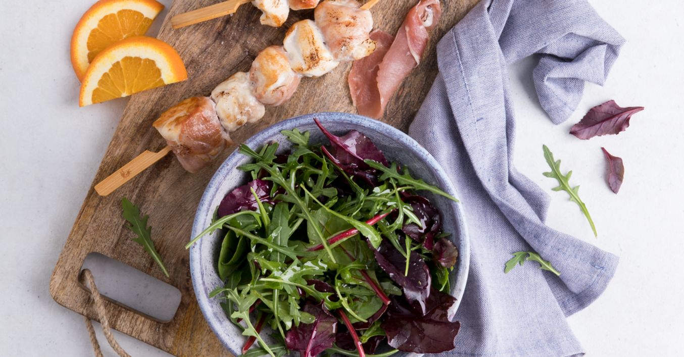 Hähnchenspieße mit Serranoschinken und Mandelsoße