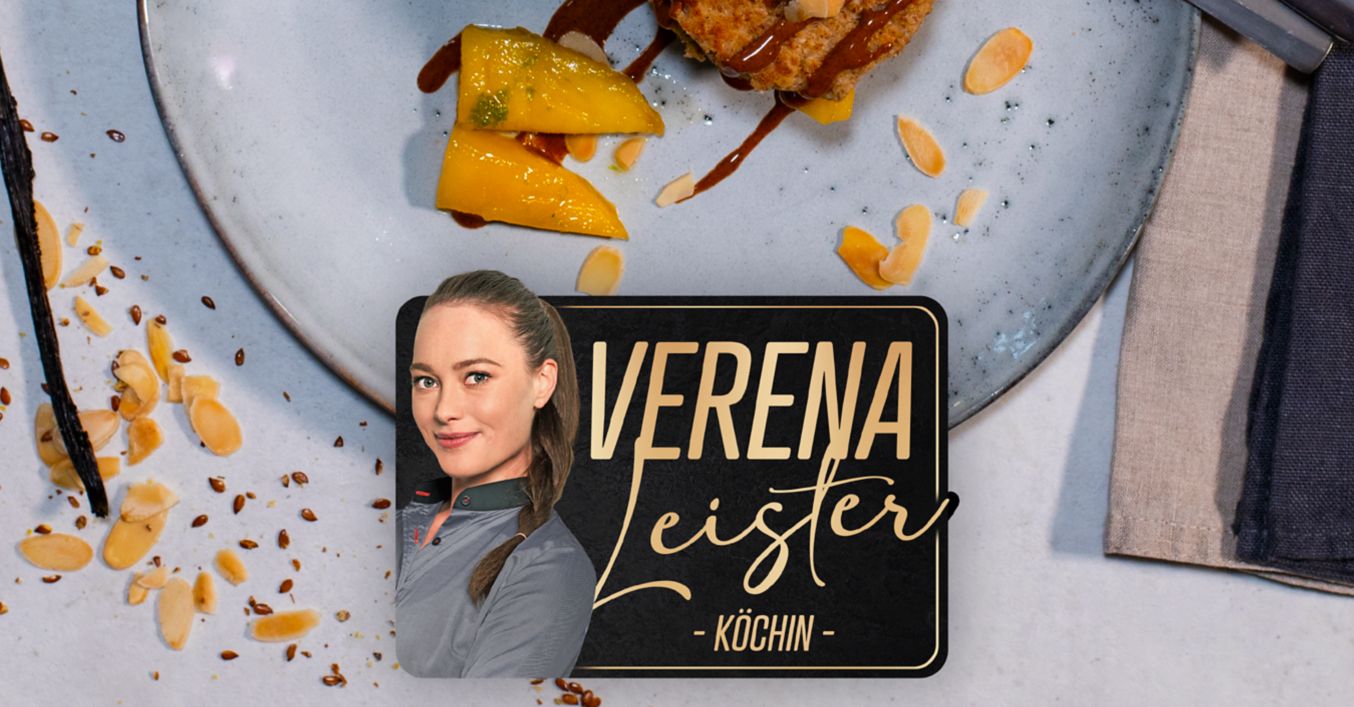 Abwechselnd je 4 Pancakes mit marinierten Mango-Spalten auf Tellern zu einem kleinen Turm schichten.