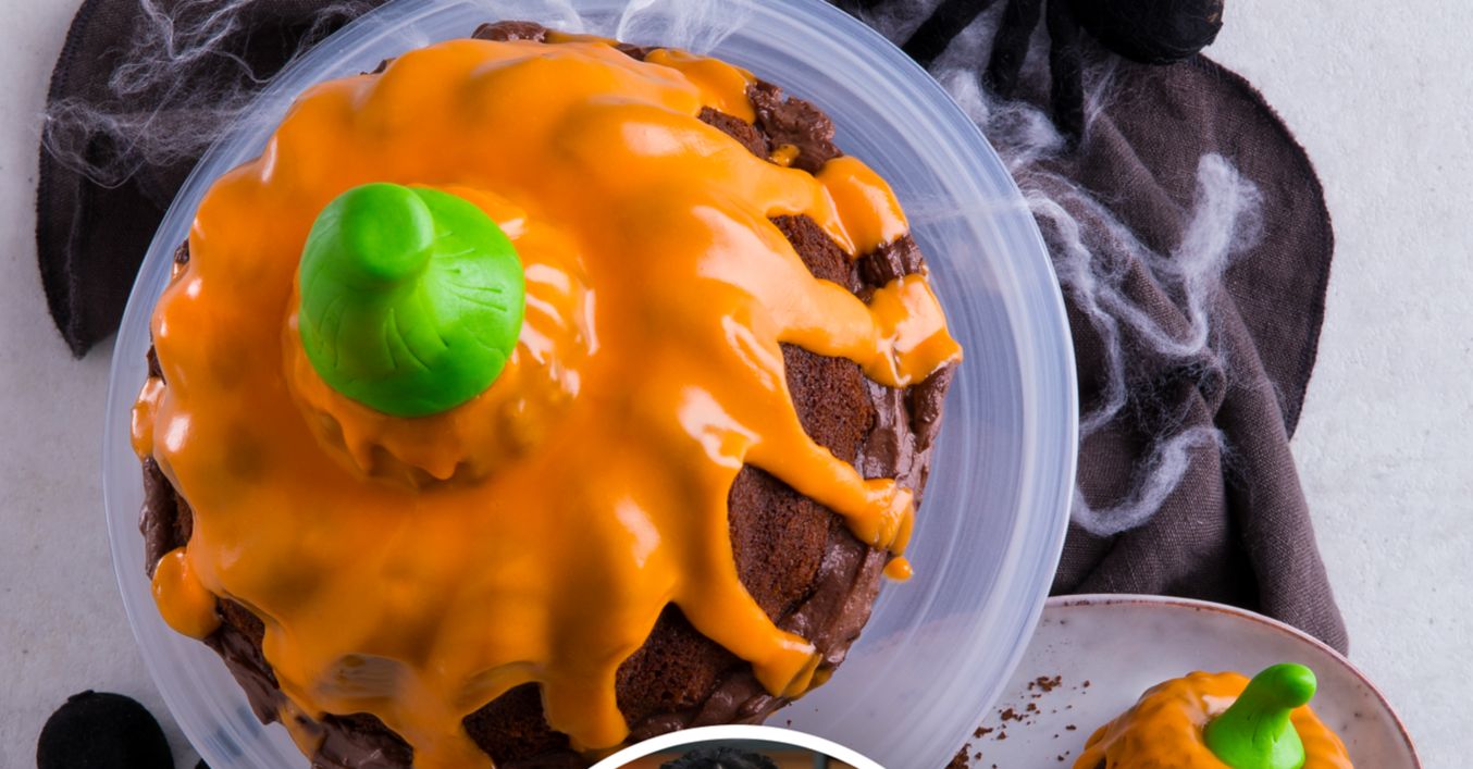Den übrig gebliebenen Mini-Gugelhupf in das Loch des großen Kürbisses legen.