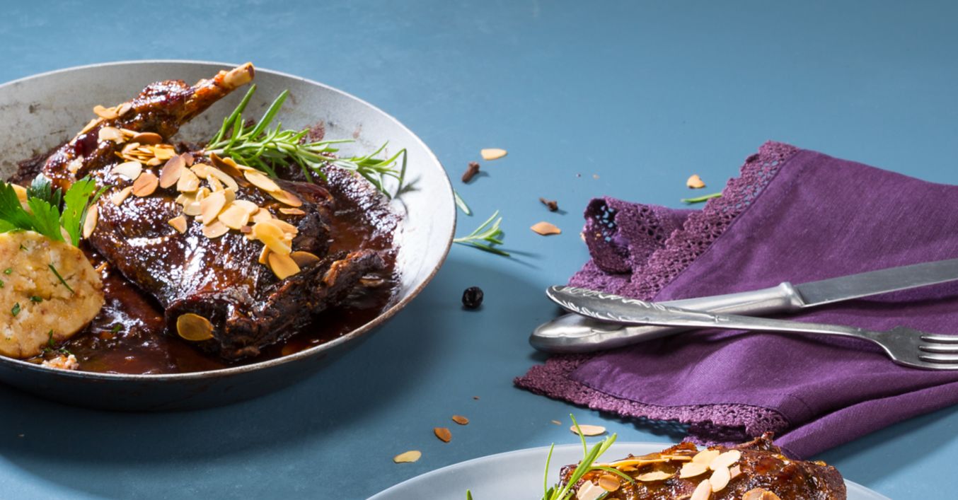 Hasenkeulen mit Mandelkruste, Semmelknödel und Feigenrotkohl
