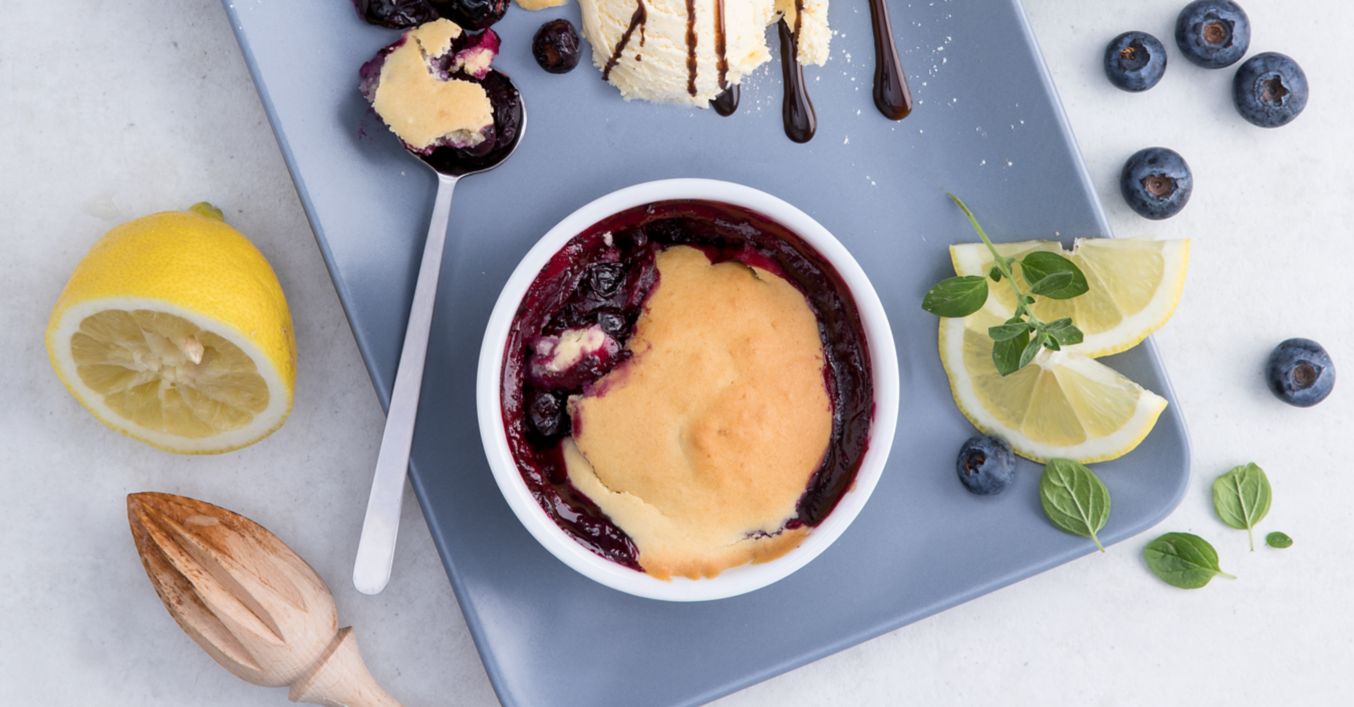 Heidelbeeren in eine Auflaufform geben und mit Zucker bestreuen. Zitronensaft dazugeben und vermengen.