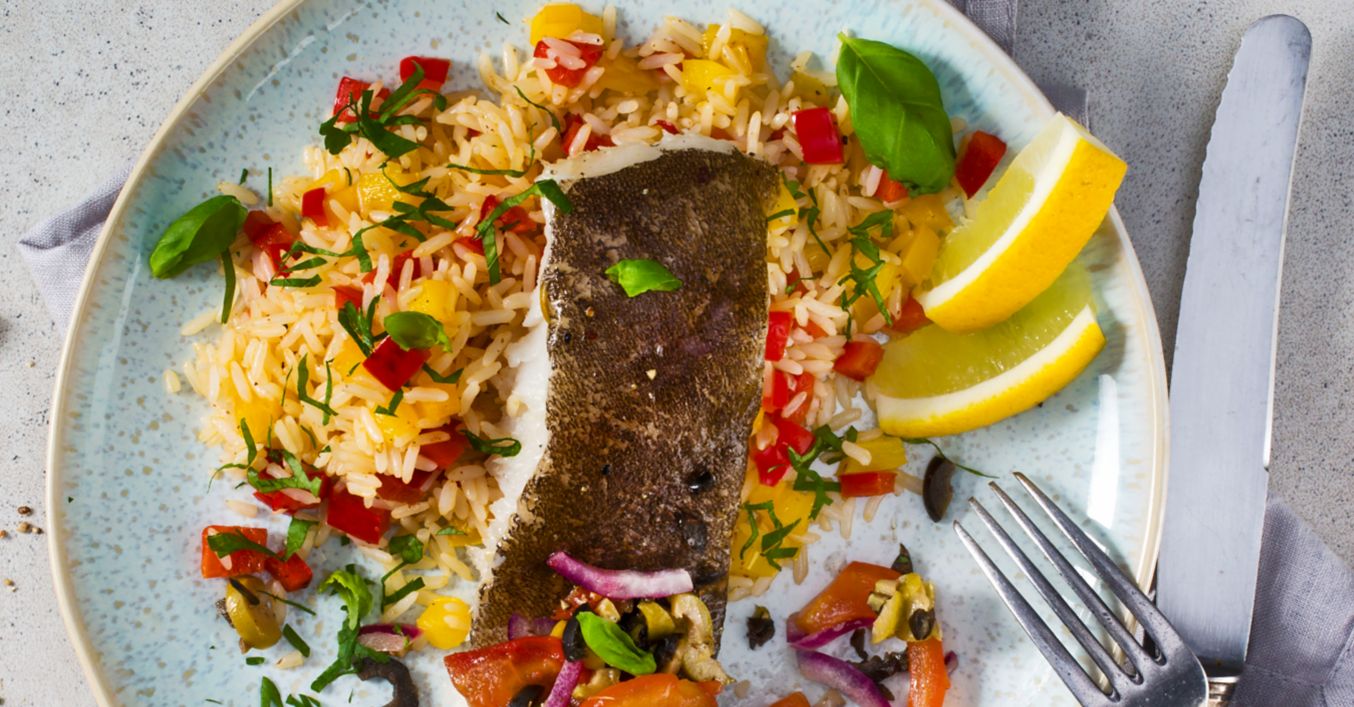 Heilbutt mit Tomaten und buntem Reis