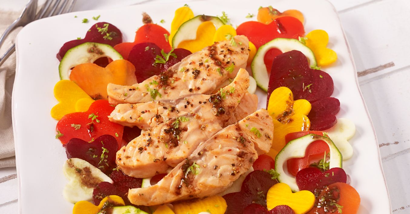 Gemüseherzen auf einer großen Platte anrichten und mit dem Dressing beträufeln. Lachsstücke auf das Carpaccio legen und servieren.