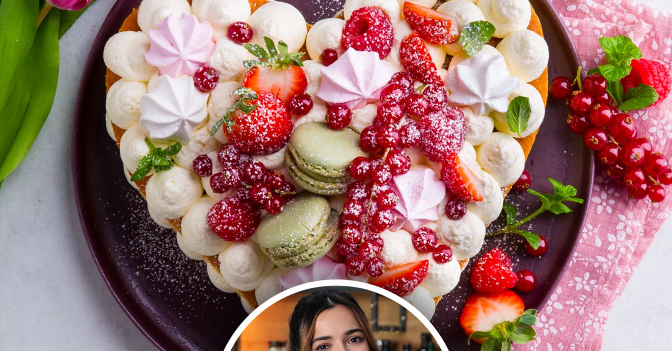 Die Tortenoberfläche mit Baiser Tropfen, Macarons, sowie frischen Früchten dekorieren. Abschließend mit Puderzucker bestäuben.