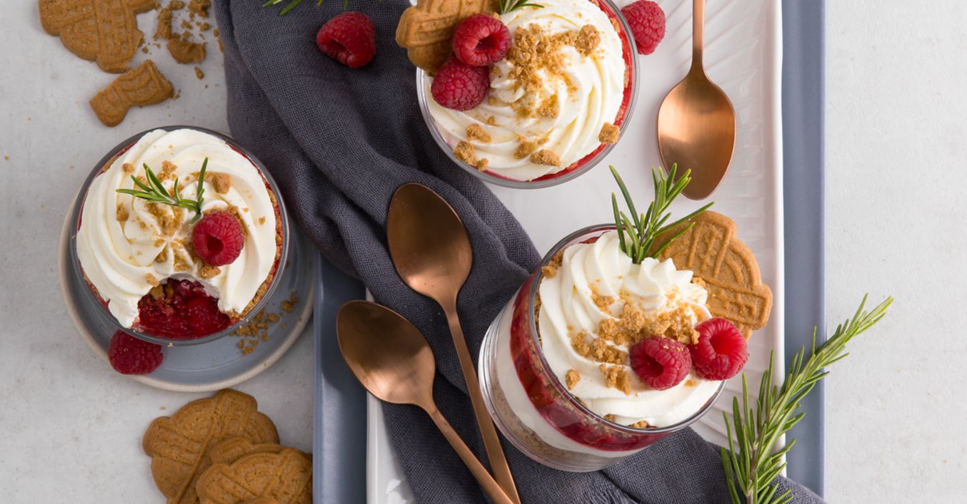 Himbeer-Schichtdessert nach Wunsch mit frischen Beeren und Mini-Spekulatius garniert servieren.