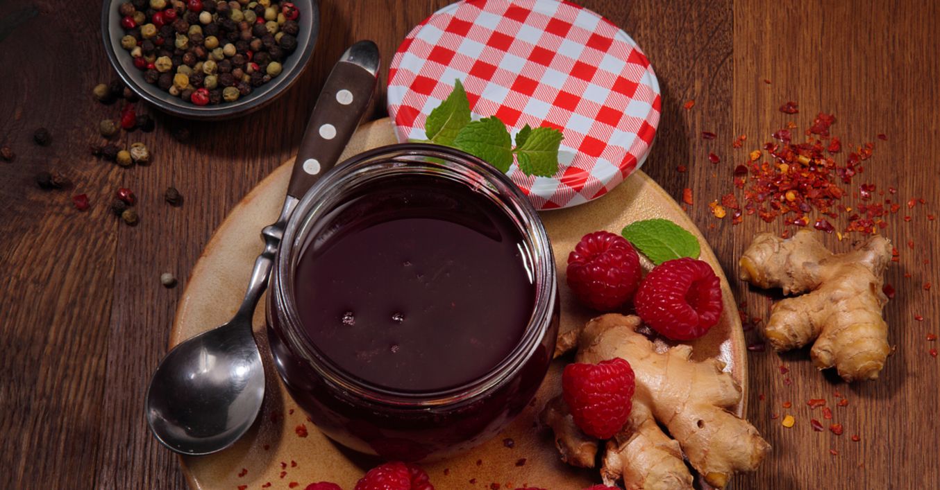 In einem Topf Himbeeren, Zucker, Essig, Ingwer, Chiliflocken, Salz und Pfeffer 10 bis 12 Minuten unter ständigem Rühren kochen. Durch ein Sieb streichen und in ein Schraubglas füllen.