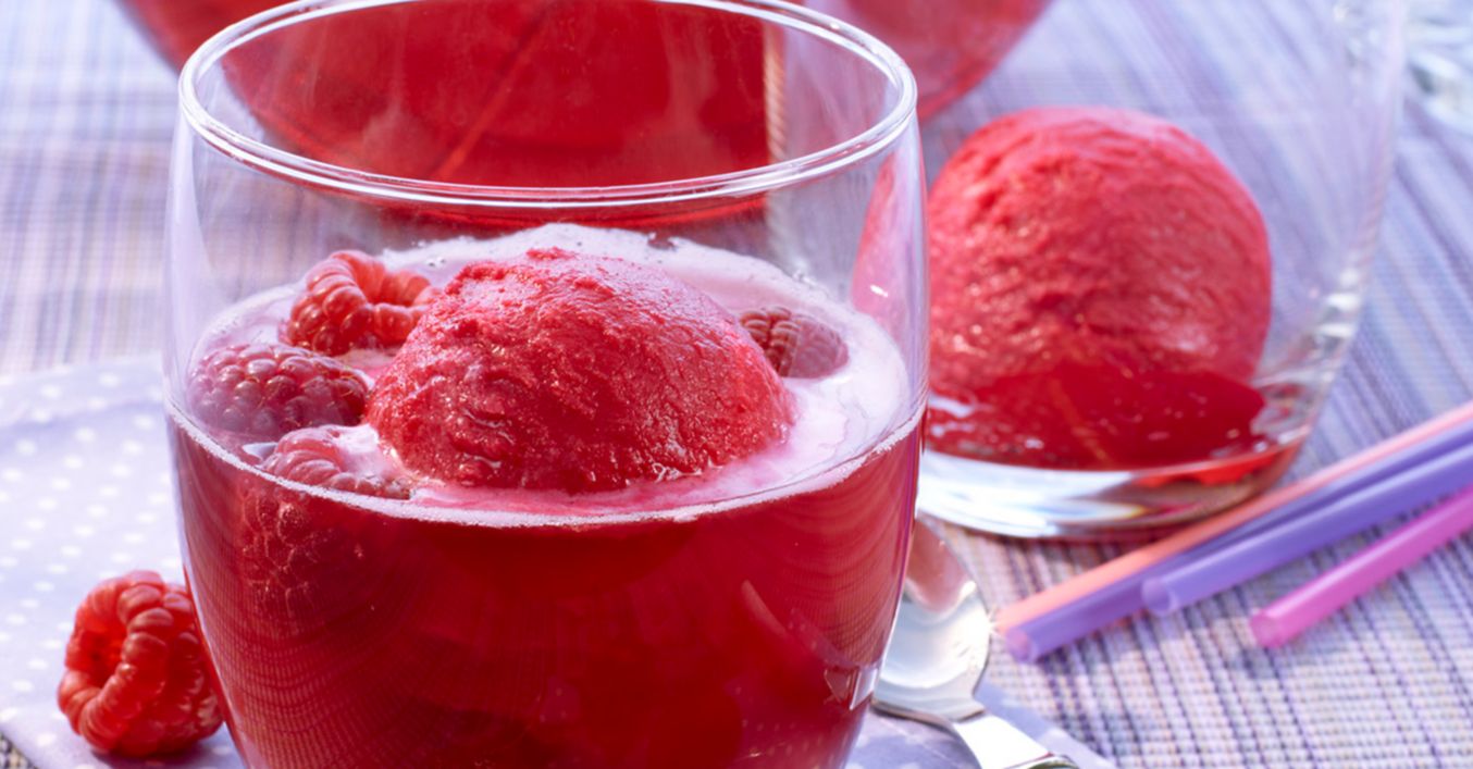 Himbeersorbet in Bowlegläsern anrichten und mit der Himbeerbowle übergießen. Nach Wunsch mit Minze garniert servieren.