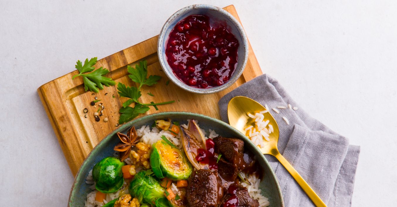 Hirschgulasch-Bowl mit Preiselbeeren und Rosenkohl
