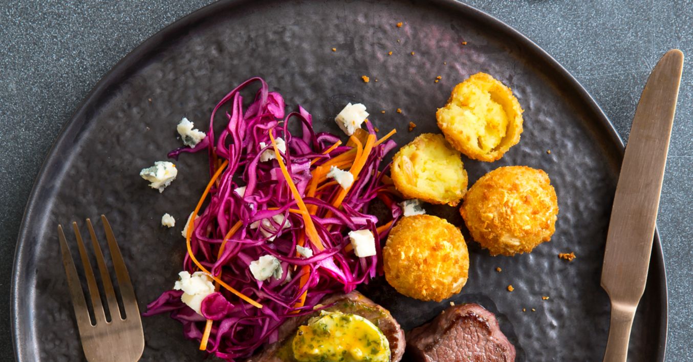 Hirschsteak mit Rotkohl-Slaw und Mandelbällchen