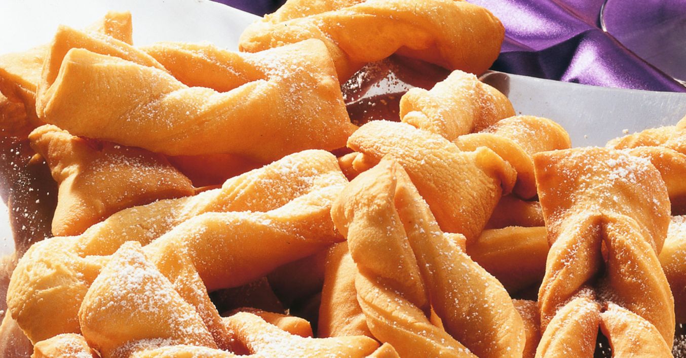 Teig circa drei Millimeter dick ausrollen, circa drei mal zehn Zentimeter große Rechtecke ausradeln, in der Mitte einen fünf Zentimeter langen Schlitz einradeln und ein Ende durch den Schlitz ziehen. Fett auf 180 Grad erhitzen und Hobelspäne darin schwimmend goldgelb ausbacken.