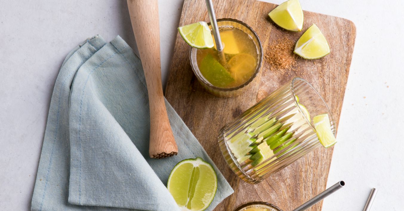 Die Limetten mit einem Stößel im Glas zerdrücken, 1 Schuss heißes Wasser und Cachaça dazugeben und verrühren.