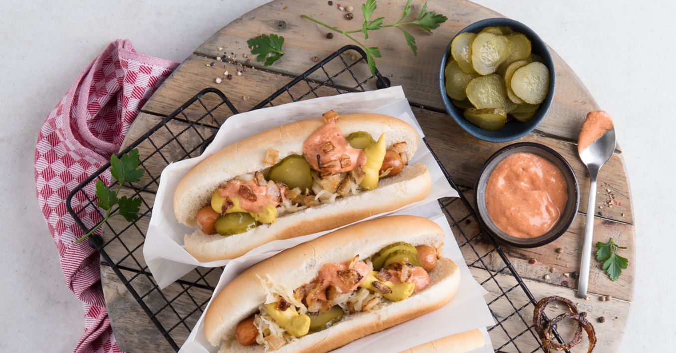 Brötchen quer auf-, aber nicht durchschneiden. Je 1 Würstchen in 1 Brötchen geben und mit Sauerkraut, Gewürzgurkenscheiben, Senf, Tomatendip und Zwiebelwürfel anrichten.