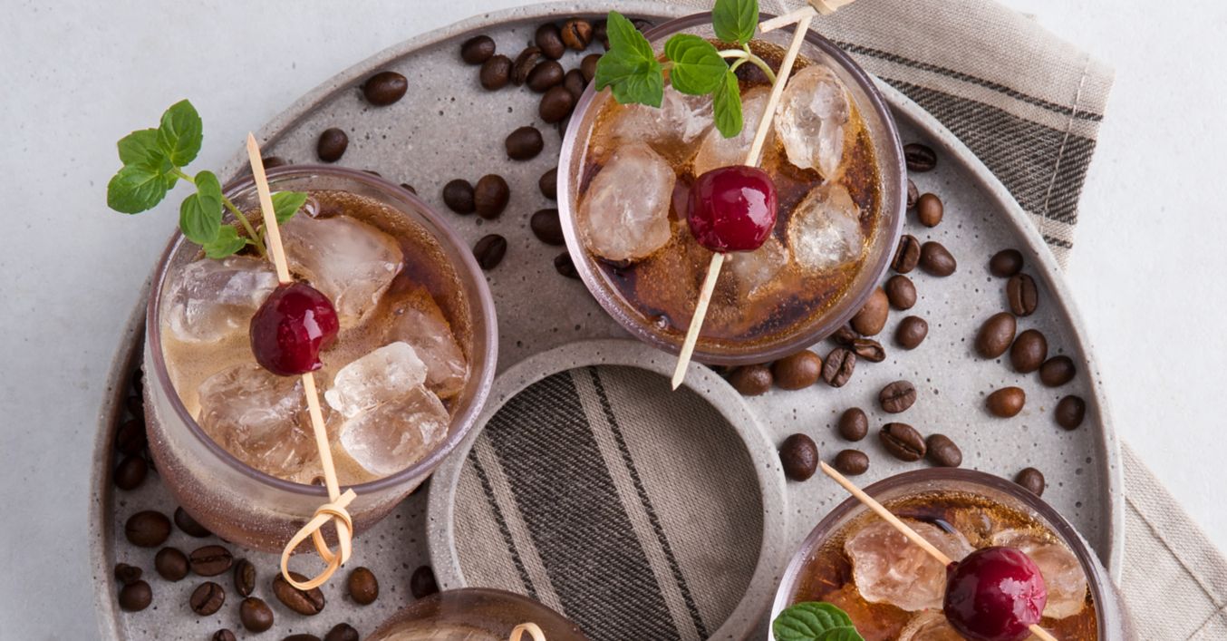 Kirsche auf einen Spieß stecken und das Glas damit garnieren.