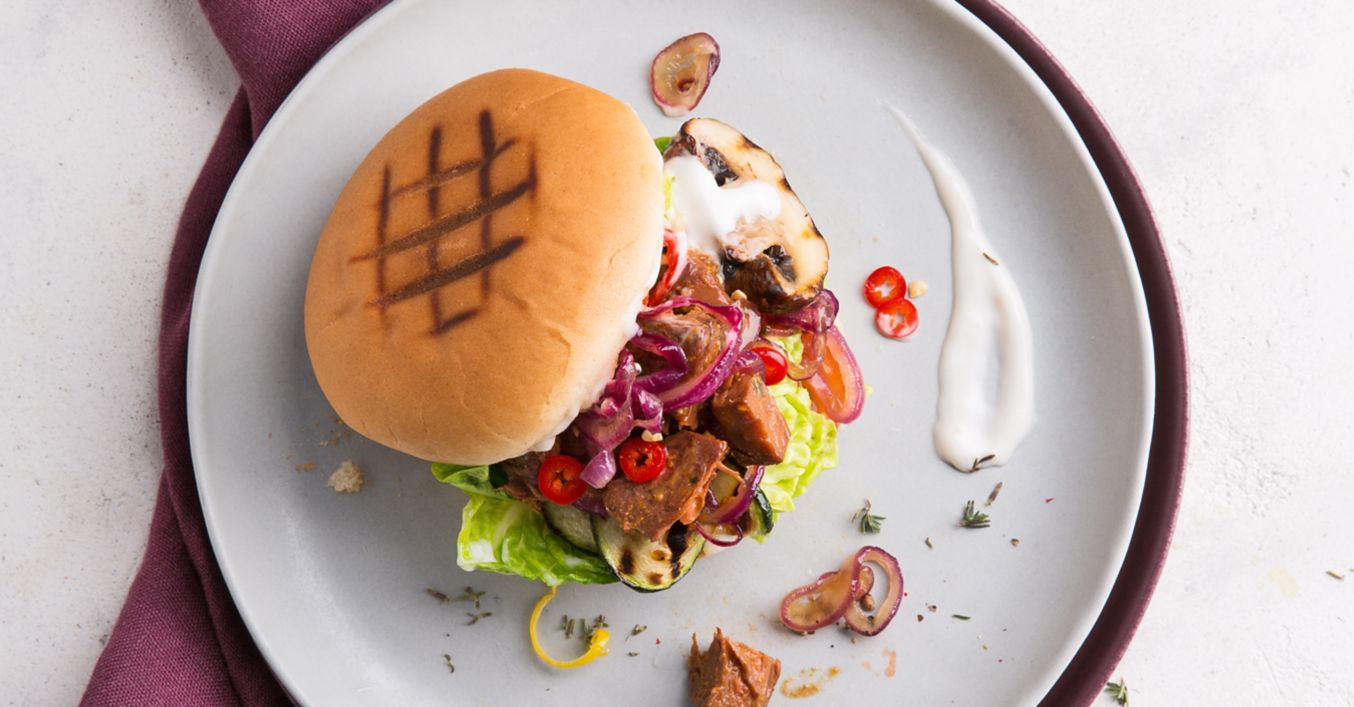 Innenseiten der Brötchen mit Mayonnaise bestreichen, mit Kopfsalatblättern, gegrilltem Gemüse, Tomatenscheiben, Zwiebeln und Jackfruit-Stücken füllen und servieren.