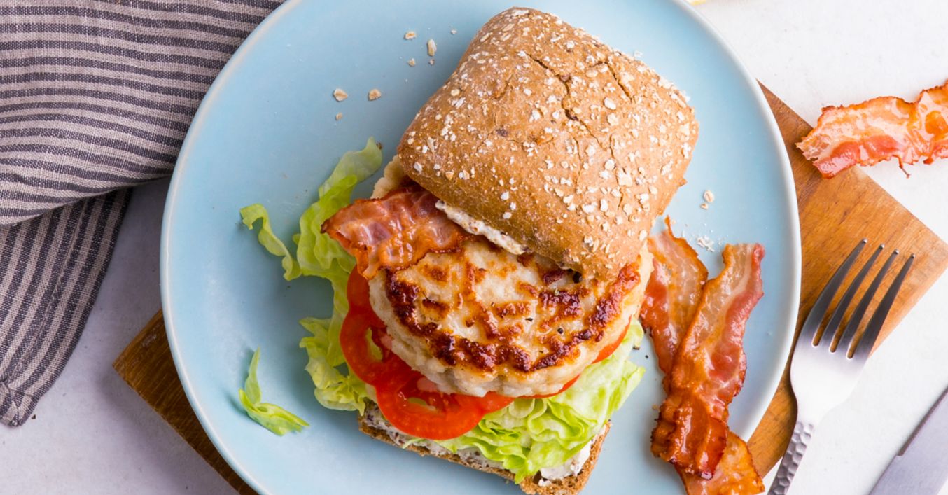 Salat und Tomatenscheiben auf die unteren Brötchenhälften legen, Burger auflegen, mit Bacon abdecken, oberere Brötchenhälften auflegen und servieren.
