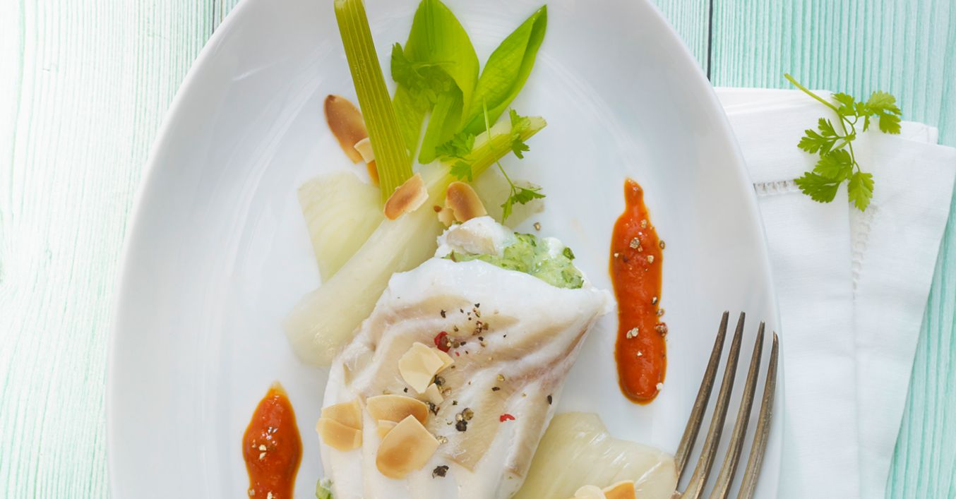 Restlichen Fisch waagerecht halbieren, mit Farce bestreichen, aufrollen und in eine ofenfeste Form geben. Röllchen mit Sud begießen, Form mit Alufolie abdecken und im vorgeheizten Backofen bei 160 Grad (Umluft: 140 Grad) circa 30 Minuten gar ziehen lassen.