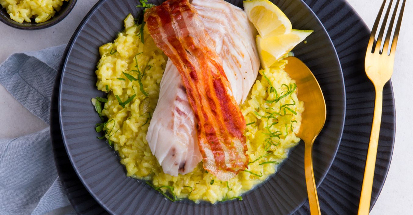 Kabeljaufilet mit Sellerie-Curry-Risotto und Speckchip