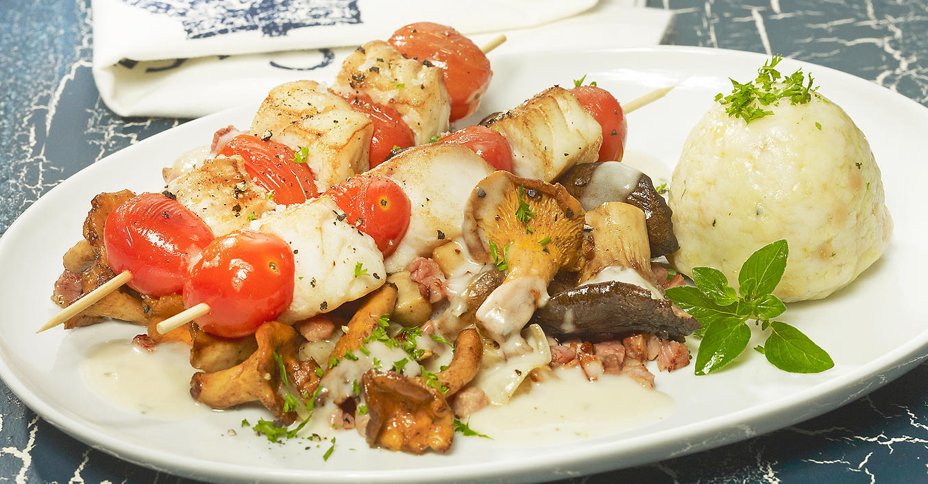 Salzen und pfeffern. Zum Schluss die Spieße mit Pilzen und Semmelknödel servieren.