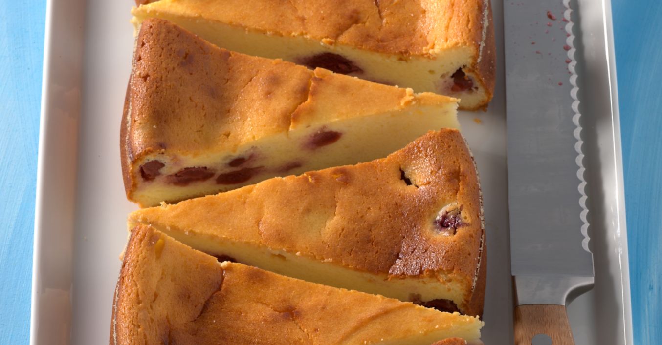 Quark, Eier, Grieß, Zucker, Puddingpulver, Vanille- und Zitronenzucker sowie das Backpulver mit den Schneebesen des Handrührgeräts gut verrühren. Dann die Butter unterrühren. Zuletzt die Kirschen daruntermischen.