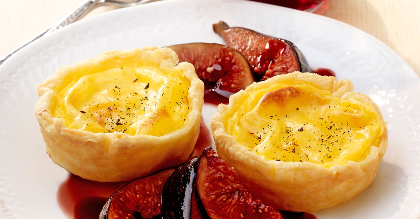 Creme in die Teigmulden füllen und auf der untersten Schiene im vorgeheizten Backofen bei 200 °C circa 20 Minuten goldbraun backen. Törtchen und Karamellfeigen auf Teller anrichten und servieren.