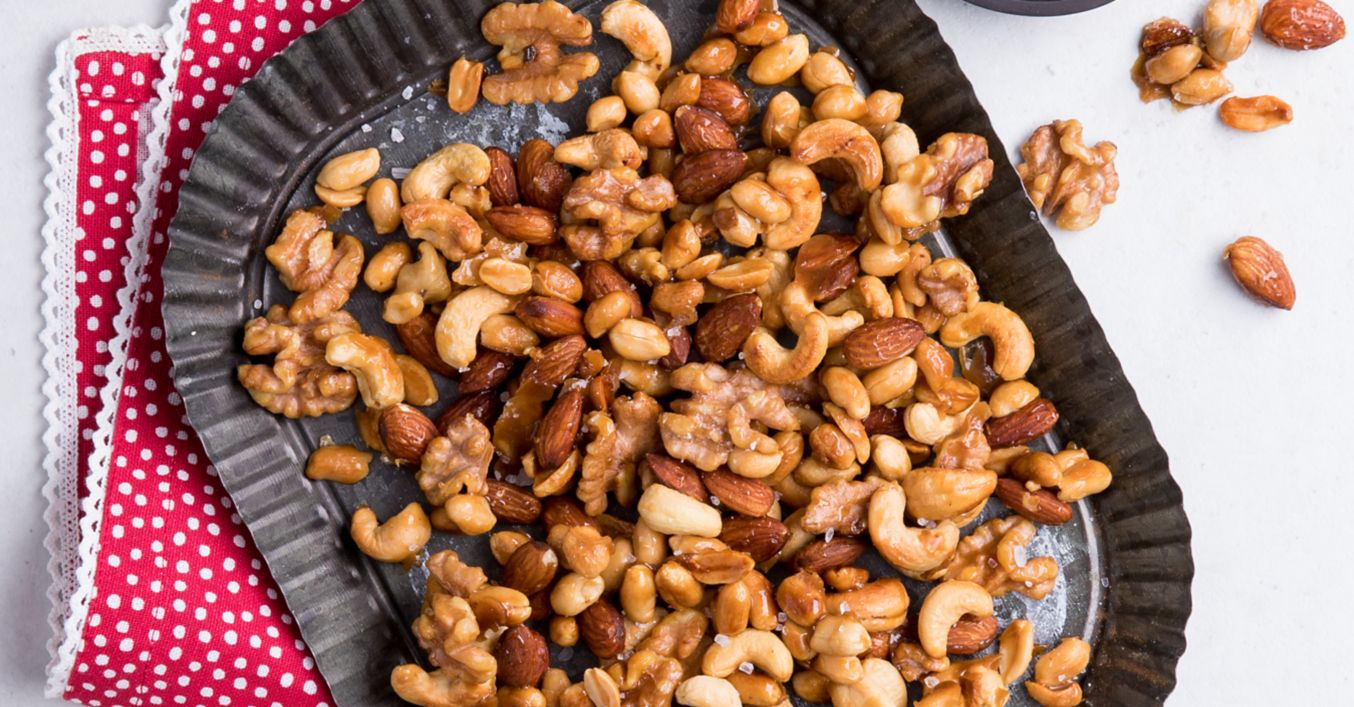 Die Nüsse aus dem Ofen direkt in die Butter-Honig-Mischung geben und vermengen. Anschließend auf einem Backblech auskühlen lassen und snacken.