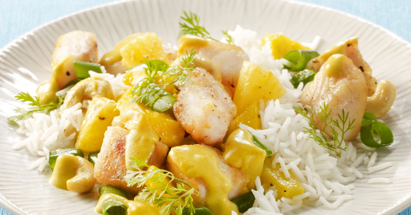 Zum Schluss die Cashewkerne grob hacken, mit dem Reis vermischen und zu dem Fischfilet servieren.