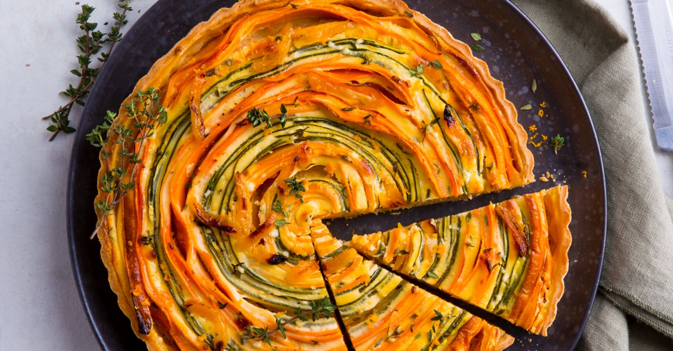 Tarte spiralförmig mit den Gemüsestreifen belegen, mit der Eiermasse übergießen und auf der untersten Schiene im Ofen circa 45 Minuten goldbraun backen. Karottenquiche in 8 Stücke schneiden und nach Wunsch mit buntem Salat servieren.