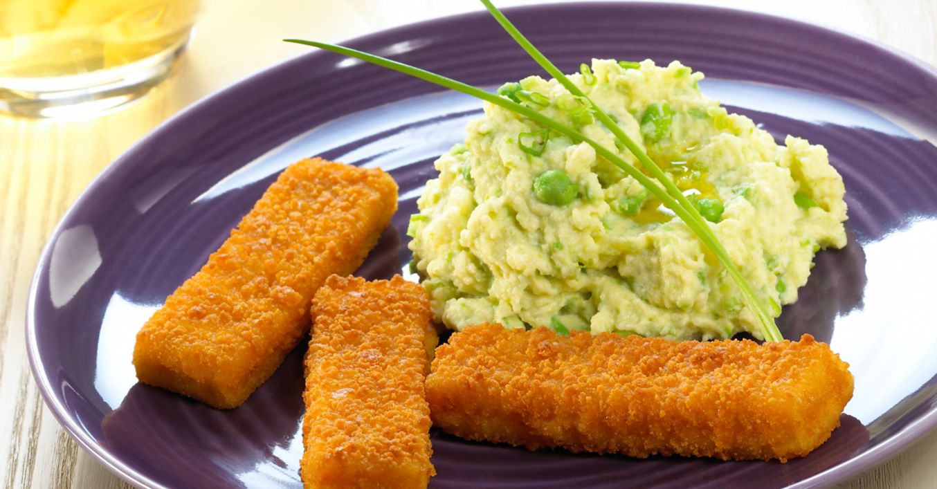 Kartoffel-Erbsen-Püree mit Fischstäbchen