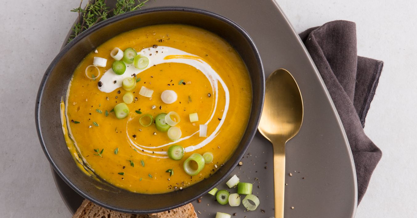 Suppe zum Transport in einen verschließbaren Behälter füllen und später in der Mikrowelle erwärmen. Nach Wunsch dazu eine Scheibe Bauernbrot servieren.