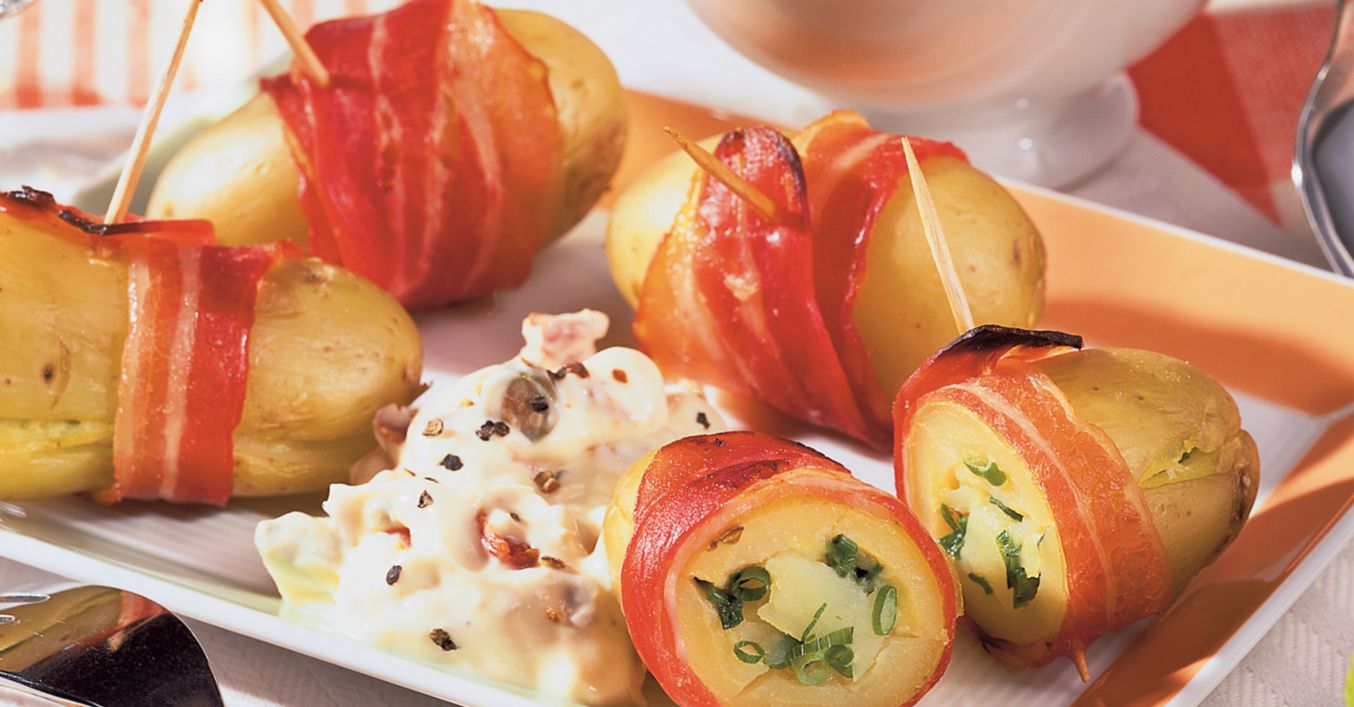 Kartoffelhälften aufeinander setzen, mit Speckscheiben umwickeln und mit Zahnstochern feststecken. Auf ein mit Backpapier ausgelegtes Backblech setzen und im vorgeheiztem Backofen ca. 20 Minuten bei 200 Grad backen (Gas Stufe 4, Umluft 180 Grad).