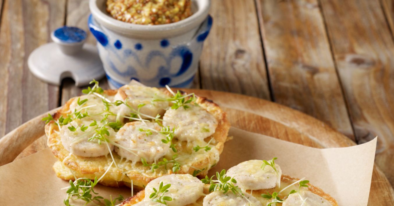 Kartoffelpuffer mit Weißwurst-Käse-Topping