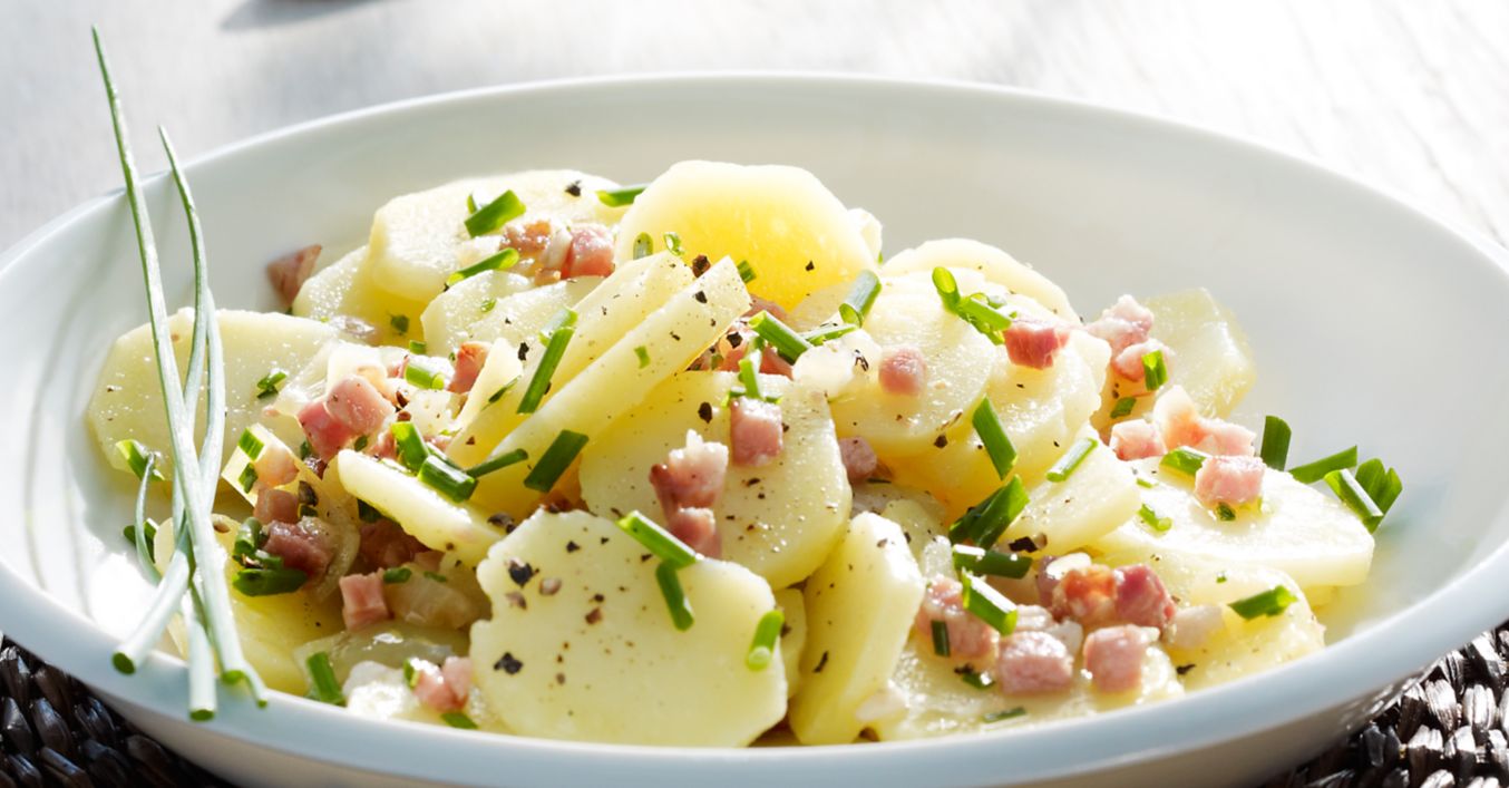 Dressing mit Kartoffeln und Zwiebel-Speckmischung vermischen und nach Wunsch mit Schnittlauch garniert servieren.