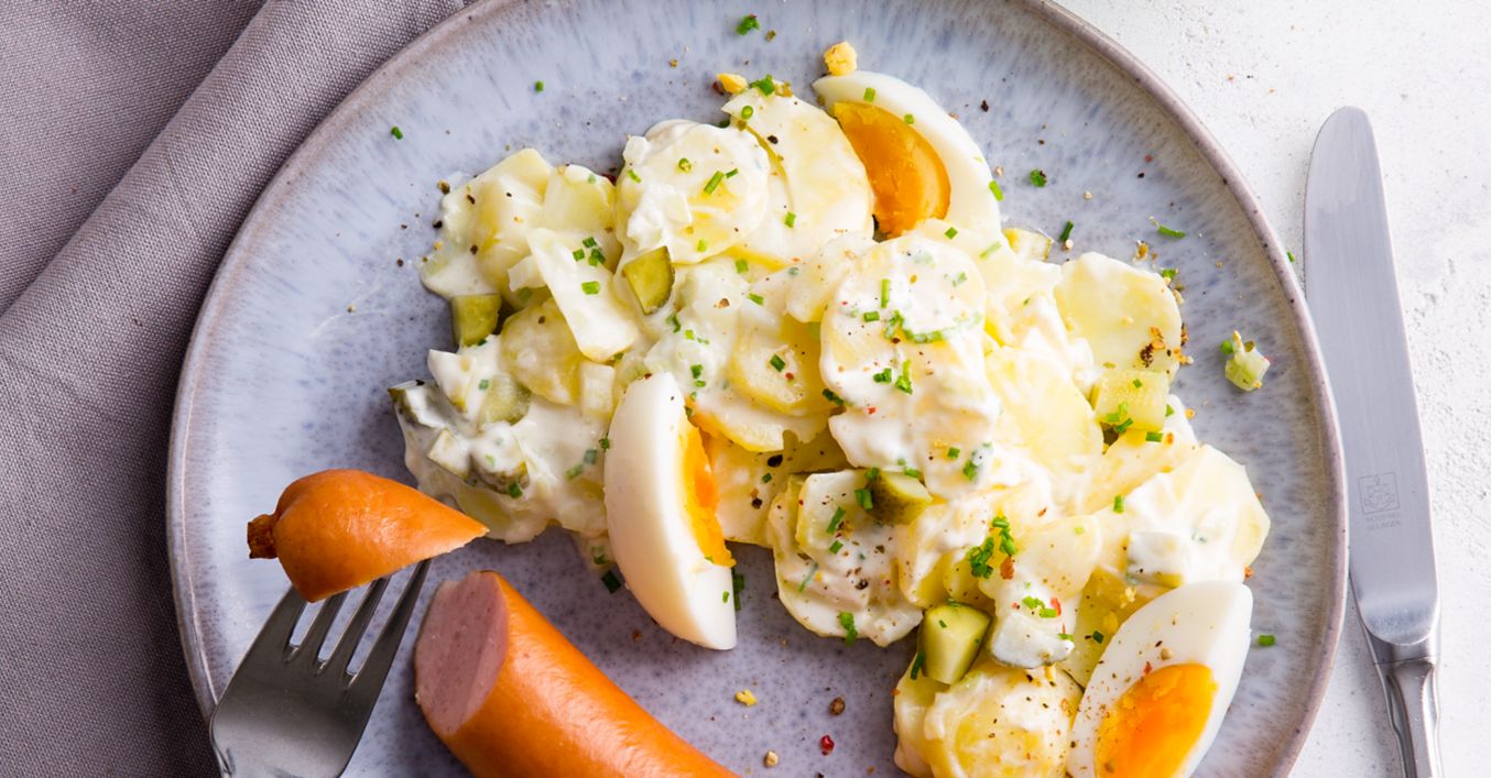 Kartoffeln waschen, mit Schale in Salzwasser circa 20 Minuten garen, abschrecken, pellen und klein schneiden. Gewürzgurken abtropfen lassen, dabei 3 Esslöffel Gurkenwasser auffangen. Kartoffeln salzen und mit Gurkenwasser mischen.