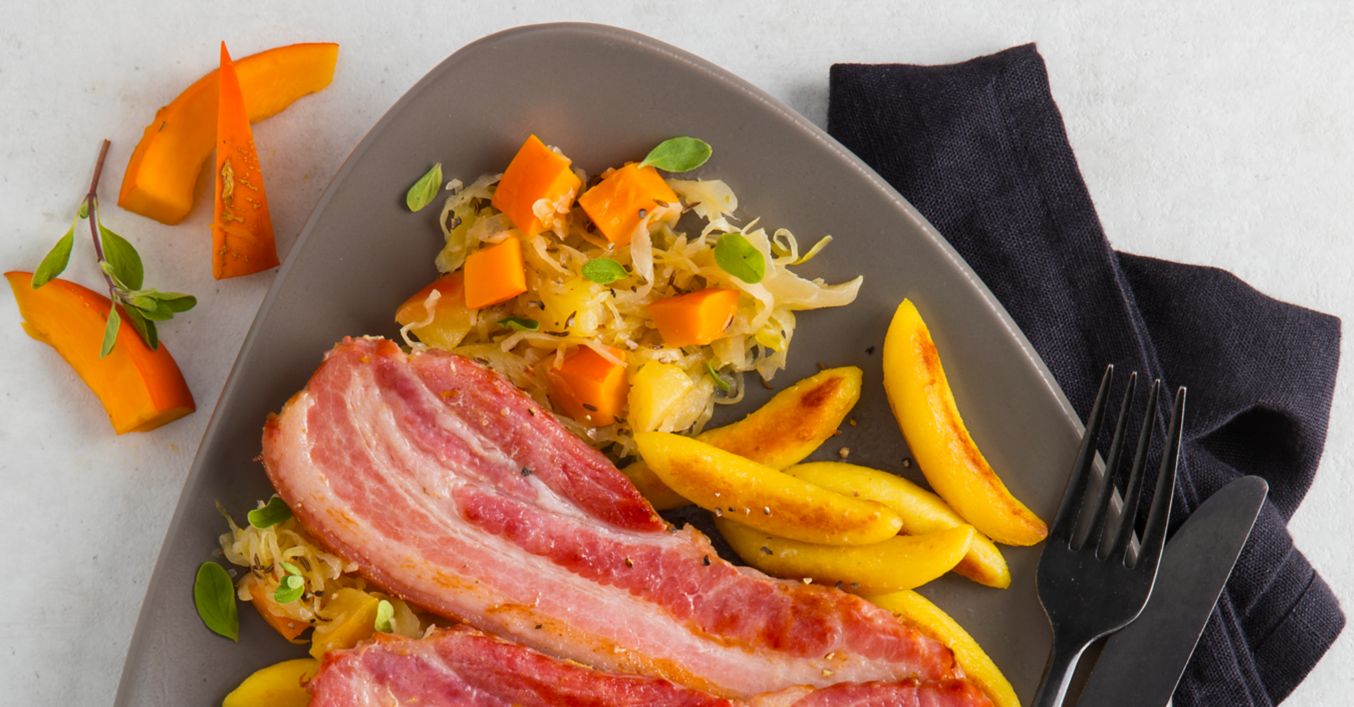 Kasseler aus dem Bratschlauch nehmen, in Scheiben schneiden und mit Kürbiskraut und Schupfnudeln servieren. Nach Wunsch mit frischem Majoran garnieren.