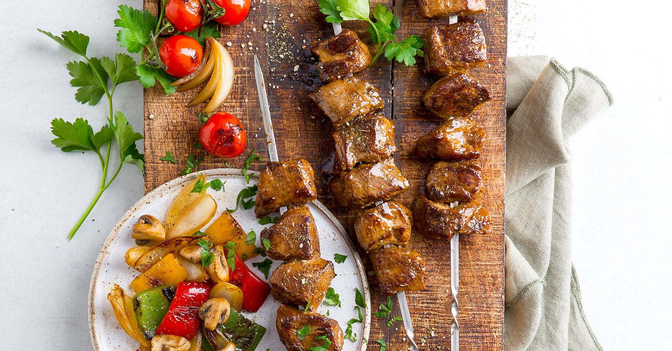 Schaschlik mit Gemüse und nach Wunsch mit knusprigem Brot servieren.