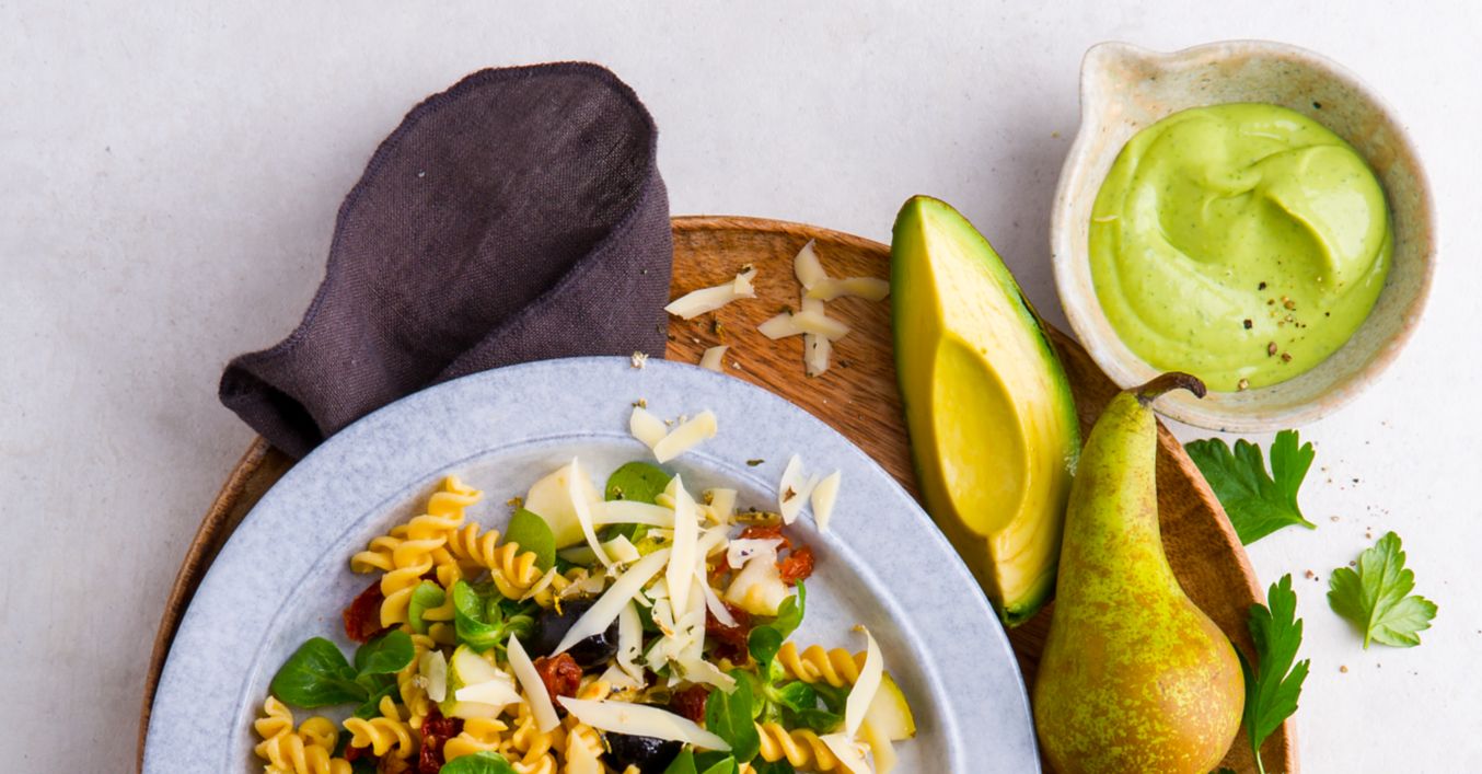 Kichererbsen-Fusilli-Salat mit Avocado-Dressing
