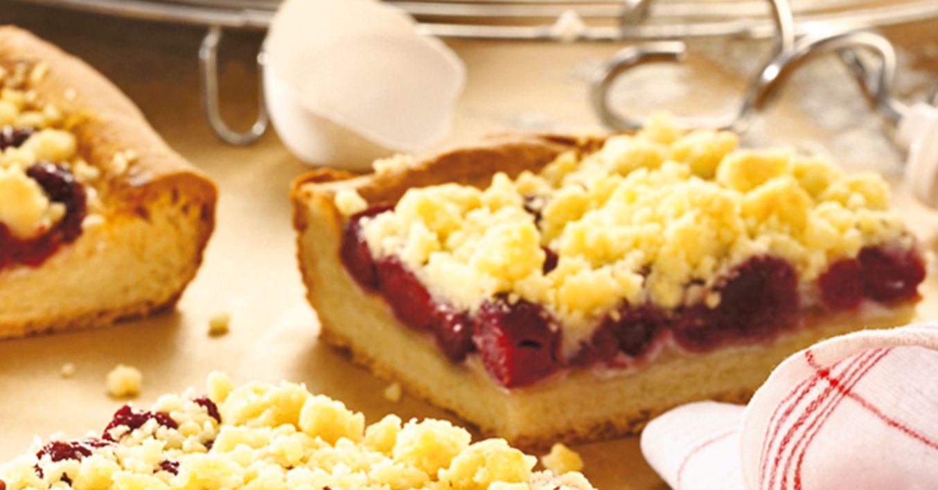 Für die Streusel Butter, Zucker und Mehl verkneten. Eine Kuchenhälfte mit den Streuseln belegen und Kuchen ca. 40 bis 50 Minuten backen im vorgeheiztem Backofen bei 180 °C backen (Gas Stufe 3, Umluft 160 °C).
