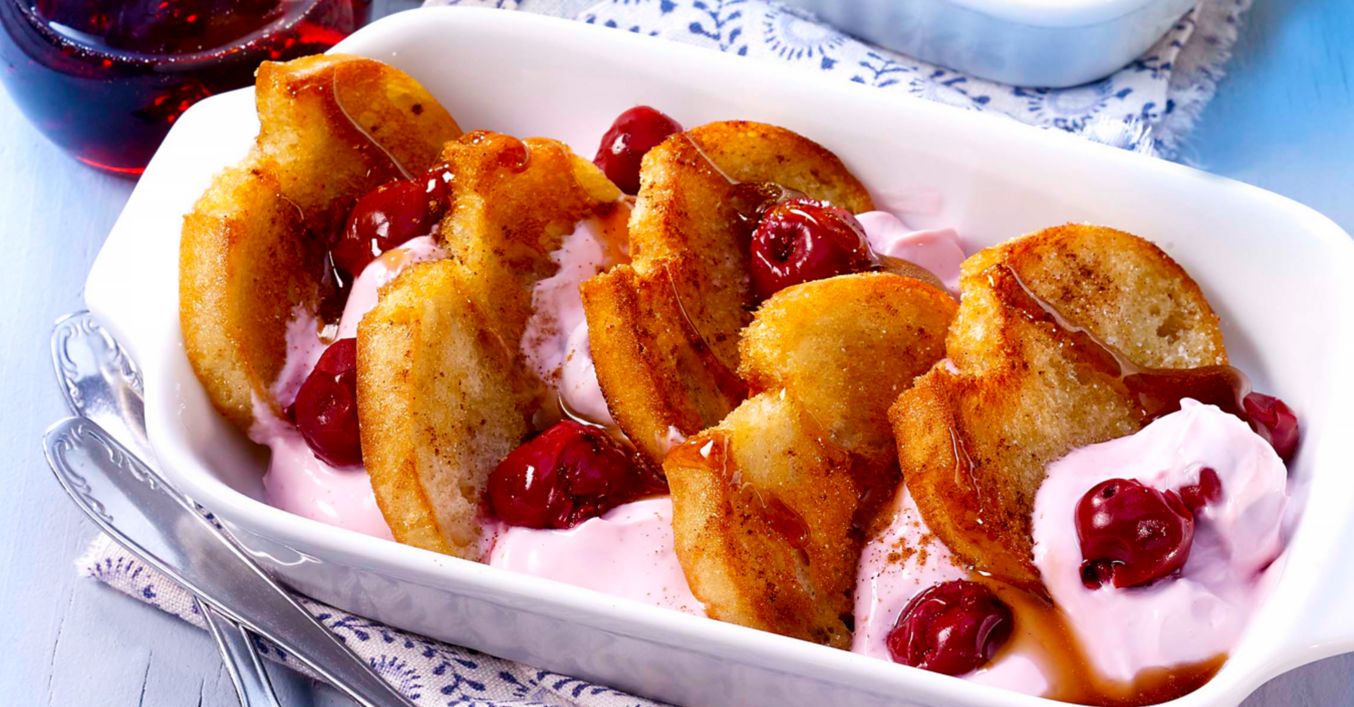Kirsch-Quarkdessert mit gerösteten Brotscheiben