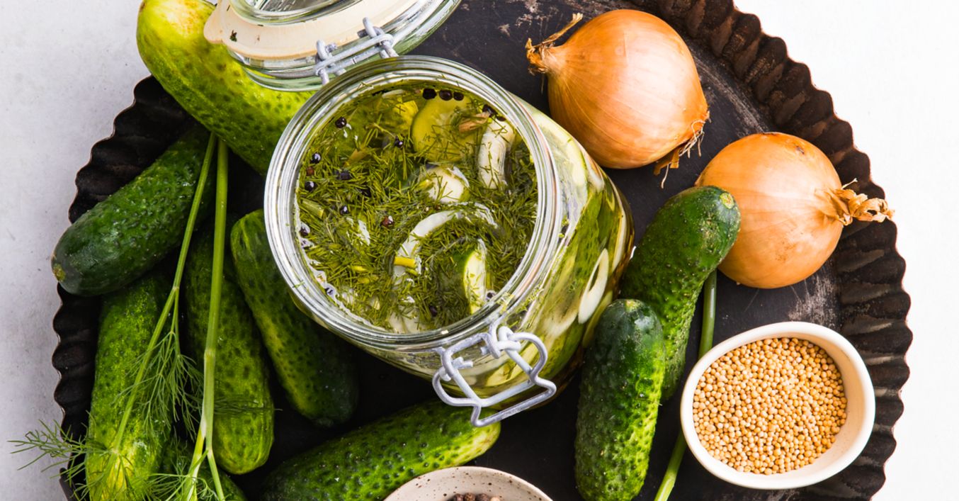 Gurken waschen, abtropfen lassen, putzen und in circa 1,5 Zentimeter dicke Scheiben schneiden. Zwiebeln abziehen und in Ringe schneiden. Dill waschen, trocken schütteln und klein schneiden.