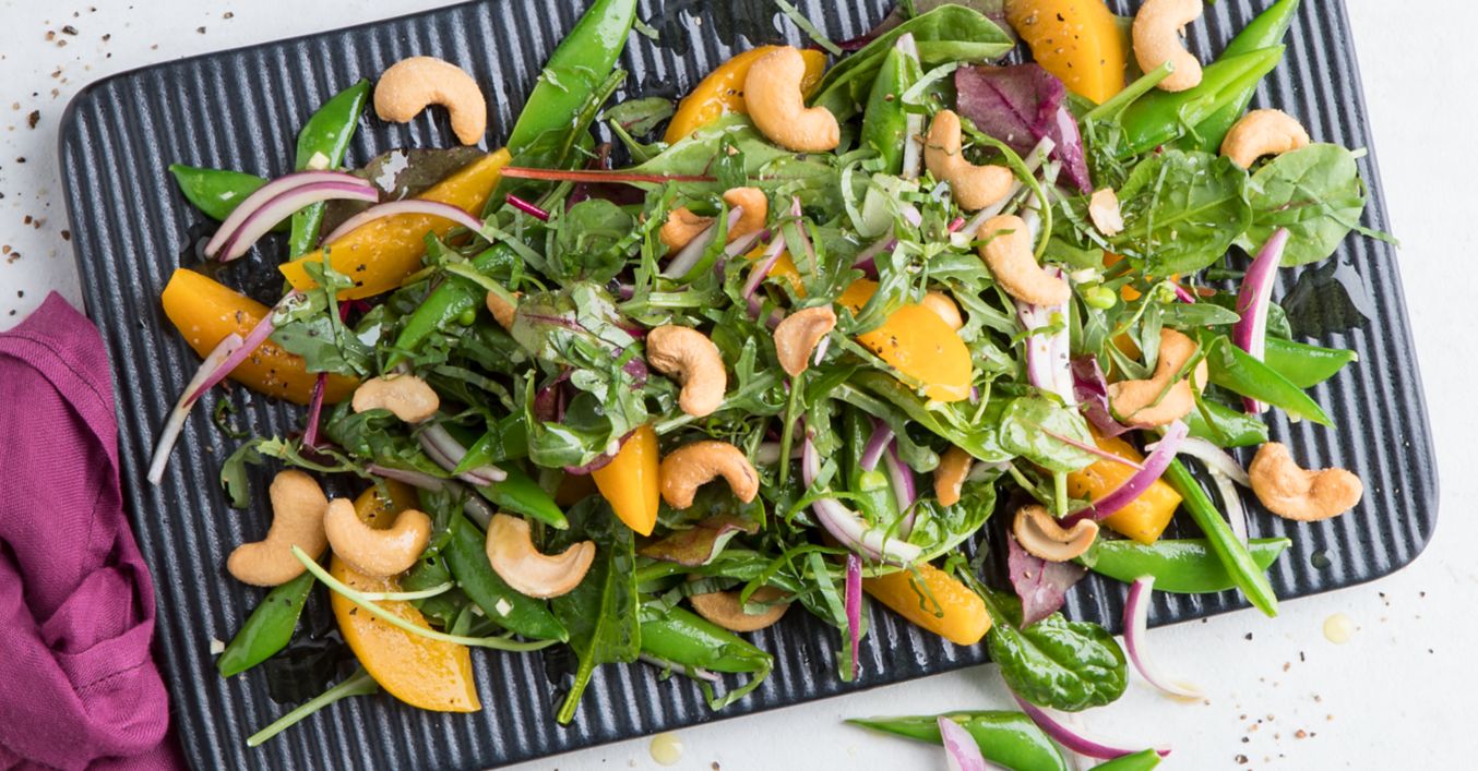 Knackerbsen, Pfirsich, Salat, Basilikum und Zwiebeln mit der Vinaigrette und der Hälfte der Cashewkerne vermengen und mit Salz und Pfeffer abschmecken.