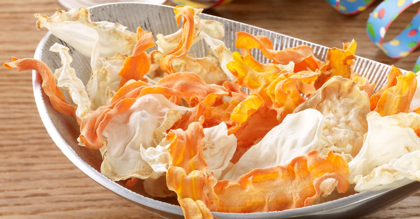 Gemüse schälen, waschen und in mundgerechte, sehr dünne Scheiben schneiden. Öl, 1/2 Teelöffel Salz und Pfeffer verrühren, mit den Gemüsescheiben vermischen und auf 2 mit Backpapier ausgelegten Backblechen verteilen. Gemüsescheiben im vorgeheizten Backofen bei 160 °C (Umluft) 30 bis 40 Minuten knusprig backen und dabei zwischendurch wenden.