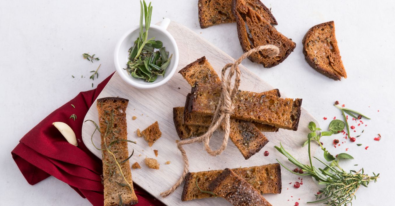 Brotstreifen hineingeben und mit Salz, Pfeffer, Knoblauchpulver und gehackten Kräutern vermengen.