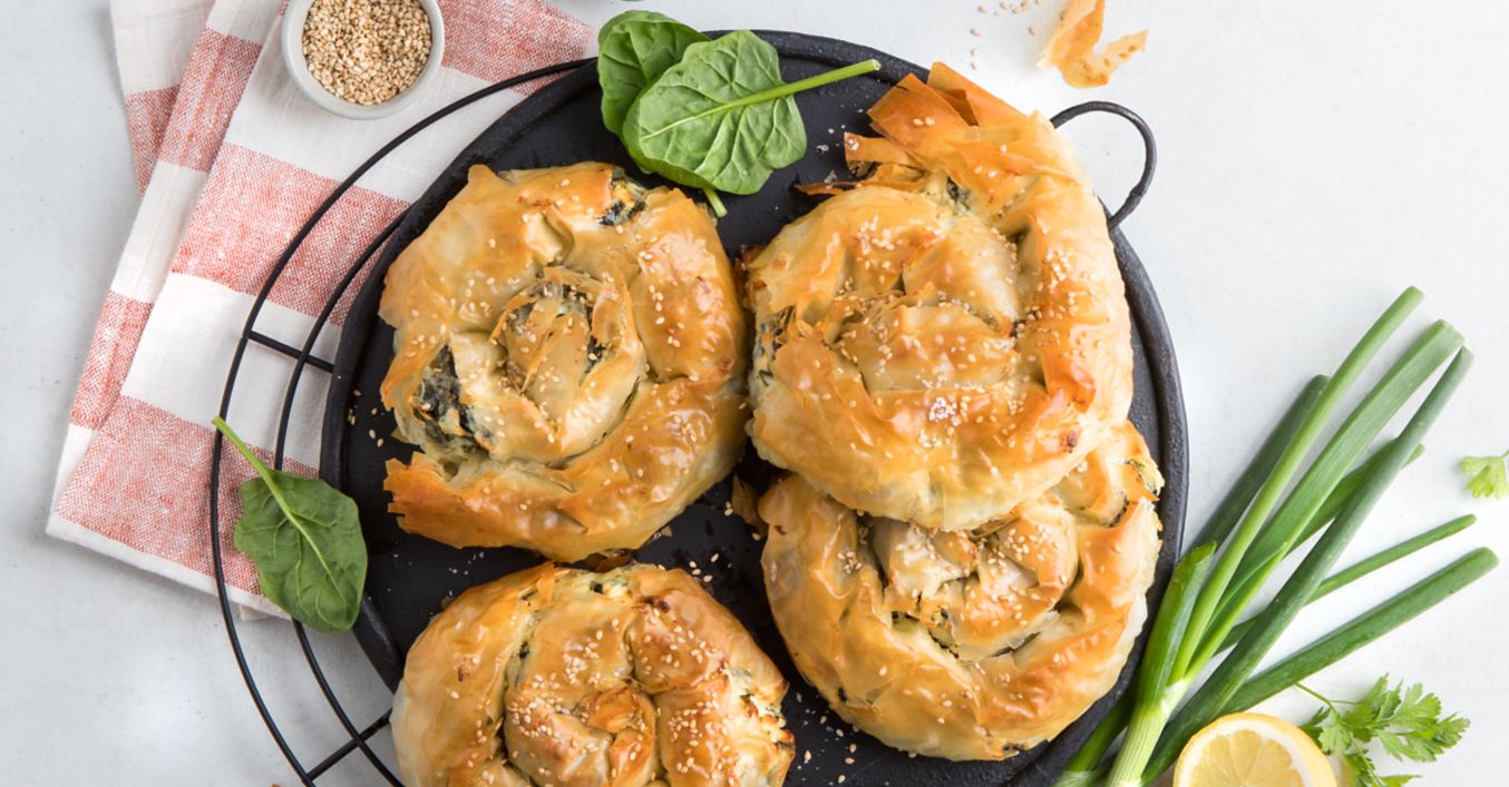 Für den Teig Butter in einem kleinen Topf schmelzen. Ein Filoteig-Blatt auf die Arbeitsfläche legen, mit Butterbestreichen und ein zweites Blatt darüberlegen. Dies sorgt für mehr Stabilität. Eine circa 3 Zentimeter breite Linie der Spinatfüllung entlang der langen Seite verteilen. Teig locker aufrollen und vorsichtig zu einer Schnecke eindrehen. Mit der Nahtseite nach unten auf ein mit Backpapier ausgelegtes Backblech legen.